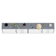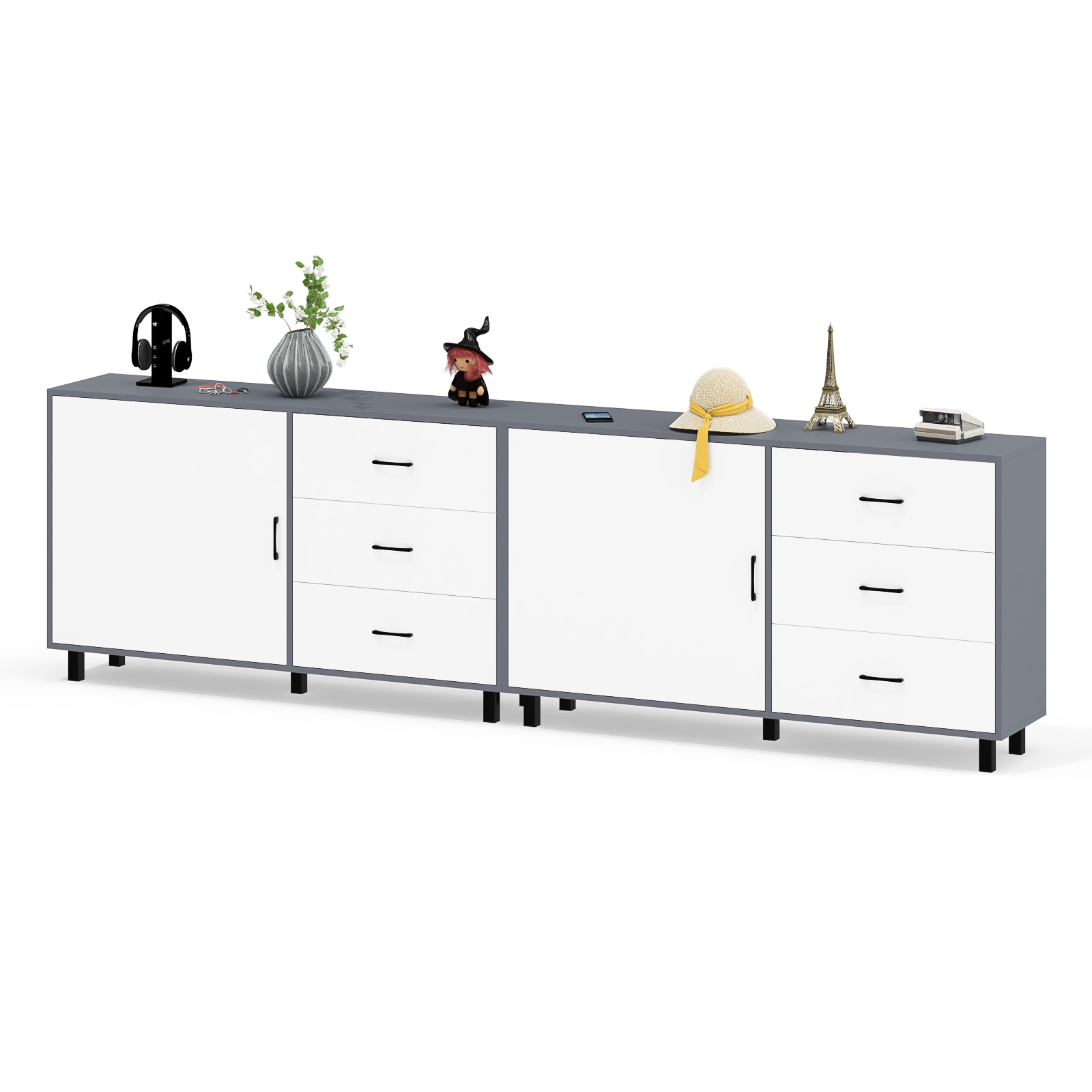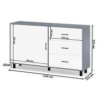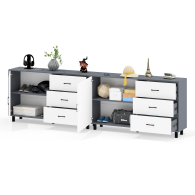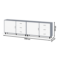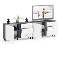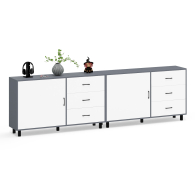 Тумба-комод может использоваться не только для хранения, но и как стильная ТВ-тумба, которая подчеркнет современный дизайн вашего интерьера. В комплекте две тумбы-комода, объединенных в единый блок. Каждый комод оснащен просторным и продуманным функционалом. Слева у каждой тумбы-комода находится распашная дверка (732х786 мм), за которой предусмотрена полка для аккуратного размещения вещей. Справа у каждой тумбы-комода расположены три одинаковых выдвижных ящика. Размер фасадов ящиков составляет 242х654 мм, что обеспечивает достаточную вместимость. Каждая тумба-комод установлена на пять металлических опор черного цвета высотой 100 мм, придающие конструкции устойчивость и современный внешний вид. Для удобства открывания двери и ящиков используются стильные металлические ручки длиной 128 мм черного цвета, которые гармонично дополняют общий дизайн.