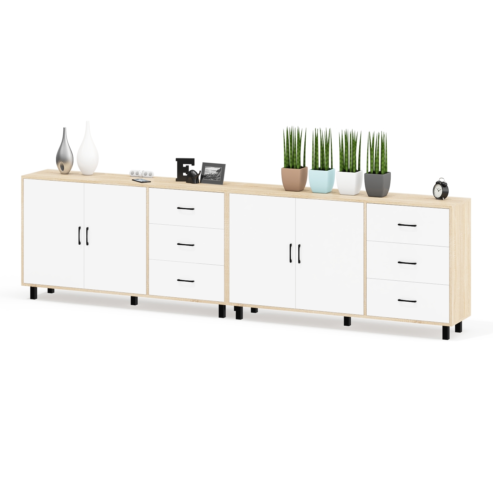 Обратите внимание, что тумбы-комоды не имеют универсальной сборки - дверцы расположены только слева, а ящики – справа. Каждая тумба-комод установлен на пять металлических опор черного цвета высотой 100 мм, придающие конструкции устойчивость и современный внешний вид. Для удобства открывания дверей и ящиков используются стильные металлические ручки длиной 128 мм черного цвета, которые гармонично дополняют общий дизайн. Корпус и фасады выполнены из высококачественной ламинированной ДСП толщиной 16 мм, а торцы надежно обработаны ПВХ-кромкой. Задняя стенка и дно ящиков изготовлены из ламинированной ДВП, что добавляет долговечности конструкции. Поставляется в разобранном виде.
