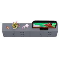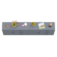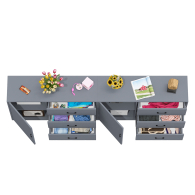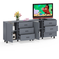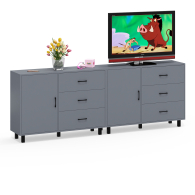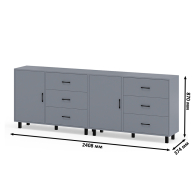Два широких комода-тумбы РВК 122-1204 могут использоваться не только для хранения, но и как стильная ТВ-тумба, которая подчеркнет современный дизайн вашего интерьера. В комплекте два комода-тумбы, объединенных в единый блок. Каждый комод оснащен просторным и продуманным функционалом. Слева у каждого комода-тумбы находится распашная дверка (732х486 мм), за которой предусмотрена полка для аккуратного размещения вещей. Справа у каждого комода-тумбы расположены три одинаковых выдвижных ящика. Размер фасадов ящиков составляет 242х654 мм, что обеспечивает достаточную вместимость. Каждый комод-тумба установлен на пять металлических опор черного цвета высотой 100 мм, придающие конструкции устойчивость и современный внешний вид. Для удобства открывания двери и ящиков используются стильные металлические ручки длиной 128 мм черного цвета, которые гармонично дополняют общий дизайн.
