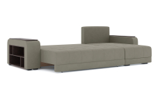 Механизм трансформации еврокнижка. Наполнение пружинный блок+ППУ. Жесткость-средняя. Чехлы подушек несъемные, наполнение крошка ППУ. Каркас ДСП, ДВП, ЛДСП, фанера, брус хвойных пород. Ящик для белья есть. Спальное место 2400х1600. Высота сиденья 430мм. Глубина сиденья без подушек 900мм. В комплекте 3 большие подушки. Накладки на подлокотниках из МДФ. Полки только в одном подлокотнике. Угол у дивана универсальный.