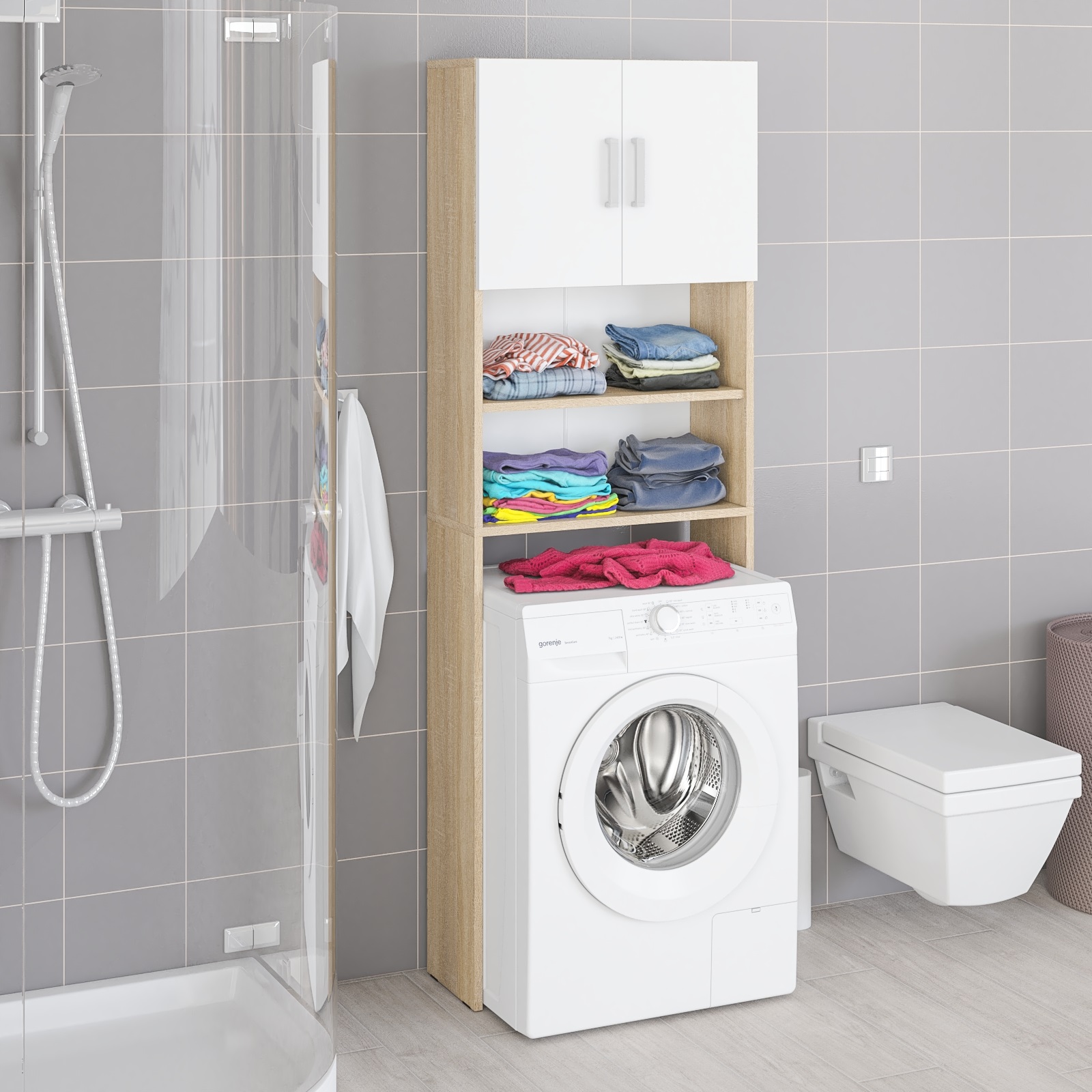 Мебель удобно размещается над стиральной машинкой, эффективно используя вертикальное пространство ванной комнаты. Шкаф оборудован верхними закрытыми двумя дверками и нижними открытыми полками — всё необходимое можно разместить удобно и компактно. Центральные полки в обоих отделениях являются съёмными, что позволяет адаптировать пространство под разные по высоте предметы. Благодаря продуманной конструкции, шкаф помогает скрыть беспорядок и поддерживать порядок в ванной, сохраняя всё необходимое под рукой.