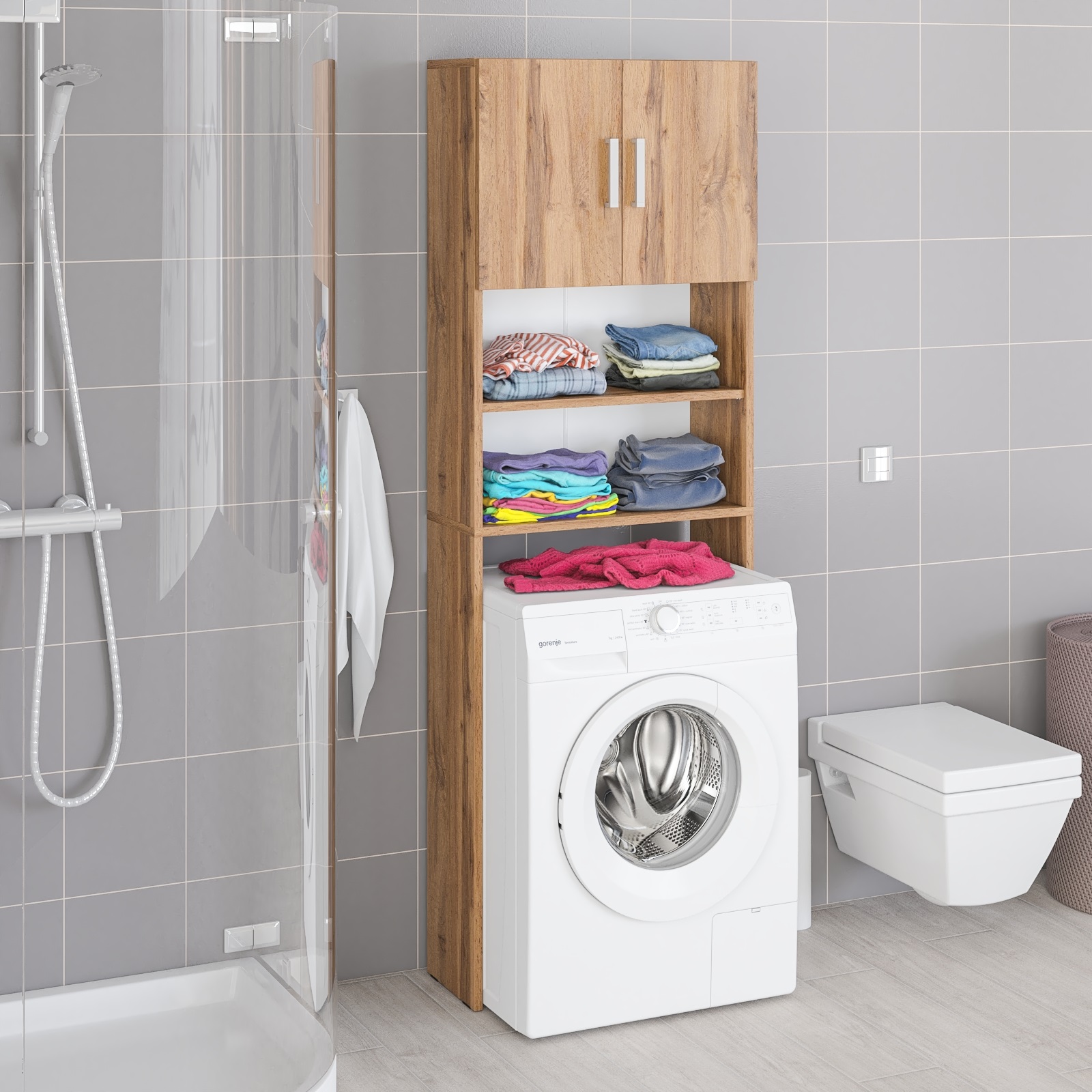 Мебель удобно размещается над стиральной машинкой, эффективно используя вертикальное пространство ванной комнаты. Шкаф оборудован верхними закрытыми двумя дверками и нижними открытыми полками — всё необходимое можно разместить удобно и компактно. Центральные полки в обоих отделениях являются съёмными, что позволяет адаптировать пространство под разные по высоте предметы. Благодаря продуманной конструкции, шкаф помогает скрыть беспорядок и поддерживать порядок в ванной, сохраняя всё необходимое под рукой.