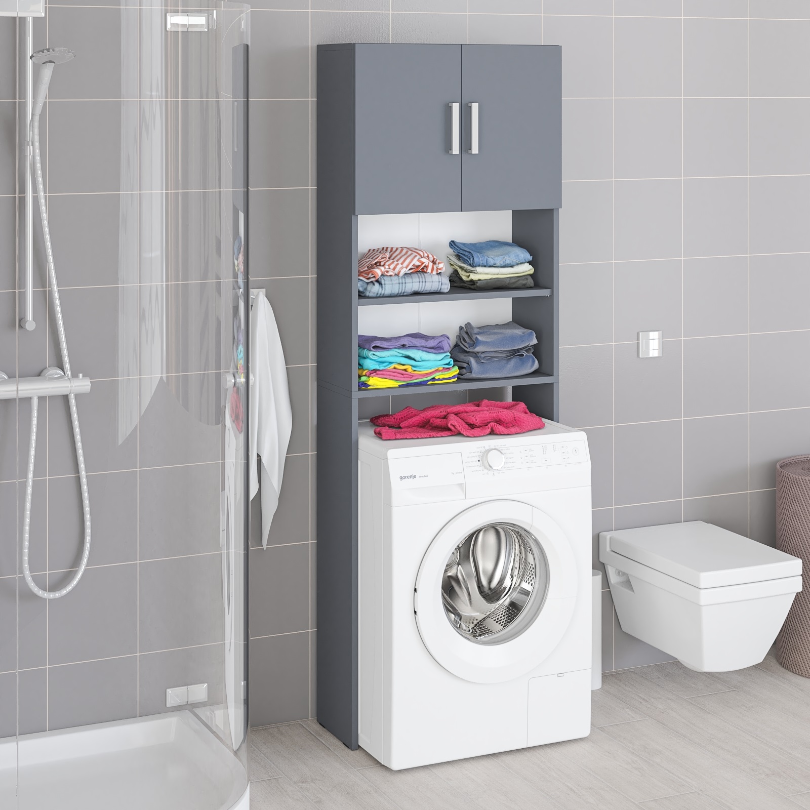 Мебель удобно размещается над стиральной машинкой, эффективно используя вертикальное пространство ванной комнаты. Шкаф оборудован верхними закрытыми двумя дверками и нижними открытыми полками — всё необходимое можно разместить удобно и компактно. Центральные полки в обоих отделениях являются съёмными, что позволяет адаптировать пространство под разные по высоте предметы. Благодаря продуманной конструкции, шкаф помогает скрыть беспорядок и поддерживать порядок в ванной, сохраняя всё необходимое под рукой.