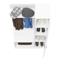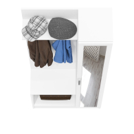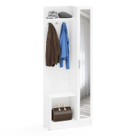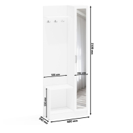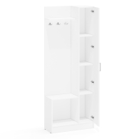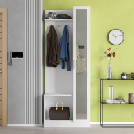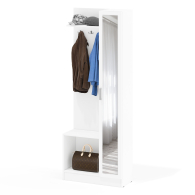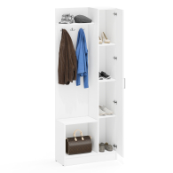 Слева сверху расположена панель с тремя двухрожковыми крючками под антресольной полкой для головных уборов, а снизу — открытая ниша для обуви. Справа — пенал с распашной дверкой, оснащённой зеркалом в полный рост размером 20х190 см. Внутри пенала — три полки, причём верхняя и нижняя съёмные для гибкой настройки хранения. Модель не имеет универсальной сборки — дверь с зеркалом устанавливается исключительно справа, а крючки с полкой — только слева. Прихожая помогает удобно разместить одежду, обувь и мелкие аксессуары, а зеркало позволяет оценить образ перед выходом. Пластиковые подпятники защищают пол от повреждений и делают установку безопасной для напольного покрытия.