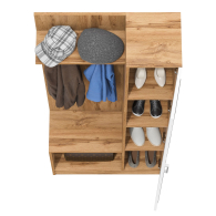 Слева сверху расположена панель с тремя двухрожковыми крючками под антресольной полкой для головных уборов, а снизу — открытая ниша для обуви. Справа — пенал с распашной дверкой, оснащённой зеркалом в полный рост размером 20х190 см. Внутри пенала — три полки, причём верхняя и нижняя съёмные для гибкой настройки хранения. Модель не имеет универсальной сборки — дверь с зеркалом устанавливается исключительно справа, а крючки с полкой — только слева. Прихожая помогает удобно разместить одежду, обувь и мелкие аксессуары, а зеркало позволяет оценить образ перед выходом. Пластиковые подпятники защищают пол от повреждений и делают установку безопасной для напольного покрытия.