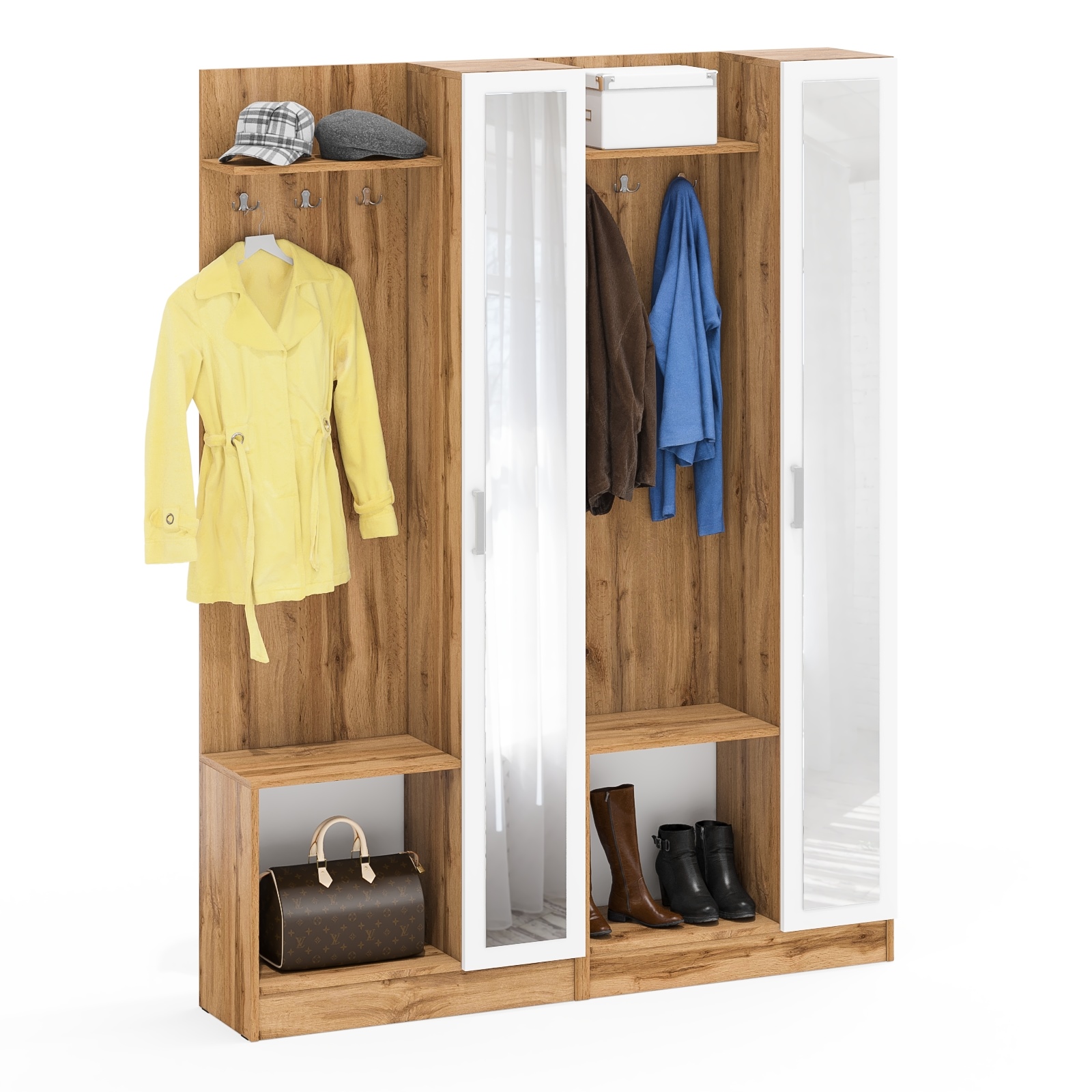В каждом модуле слева сверху расположена панель с тремя двухрожковыми крючками под антресольной полкой, а внизу — открытая ниша для обуви. Справа — высокий пенал с распашной дверкой, оснащённой зеркалом в полный рост размером 20х190 см. Внутри пенала три полки, верхняя и нижняя из них съёмные. Сборка не универсальная — дверь с зеркалом всегда справа, а панель с крючками — слева. Такой комплект обеспечивает вдвое больше мест для хранения и два зеркала, что особенно удобно для семейного использования. Пластиковые подпятники защищают пол от повреждений и делают установку безопасной для напольного покрытия.