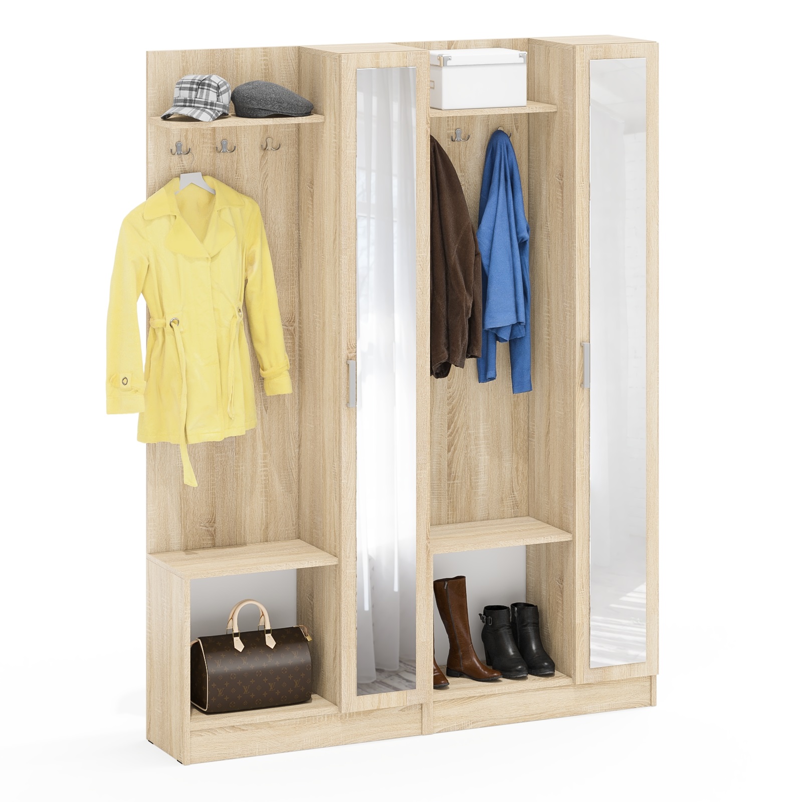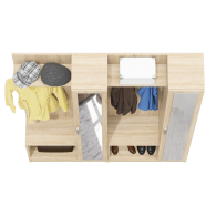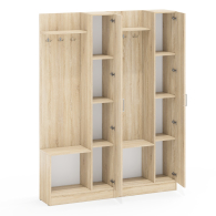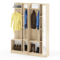 В каждом модуле слева сверху расположена панель с тремя двухрожковыми крючками под антресольной полкой, а внизу — открытая ниша для обуви. Справа — высокий пенал с распашной дверкой, оснащённой зеркалом в полный рост размером 20х190 см. Внутри пенала три полки, верхняя и нижняя из них съёмные. Сборка не универсальная — дверь с зеркалом всегда справа, а панель с крючками — слева. Такой комплект обеспечивает вдвое больше мест для хранения и два зеркала, что особенно удобно для семейного использования. Пластиковые подпятники защищают пол от повреждений и делают установку безопасной для напольного покрытия.