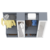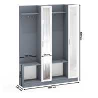 В каждом модуле слева сверху расположена панель с тремя двухрожковыми крючками под антресольной полкой, а внизу — открытая ниша для обуви. Справа — высокий пенал с распашной дверкой, оснащённой зеркалом в полный рост размером 20х190 см. Внутри пенала три полки, верхняя и нижняя из них съёмные. Сборка не универсальная — дверь с зеркалом всегда справа, а панель с крючками — слева. Такой комплект обеспечивает вдвое больше мест для хранения и два зеркала, что особенно удобно для семейного использования. Пластиковые подпятники защищают пол от повреждений и делают установку безопасной для напольного покрытия.