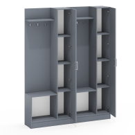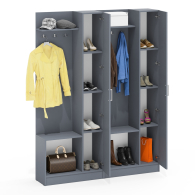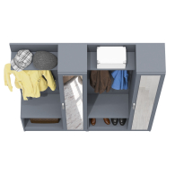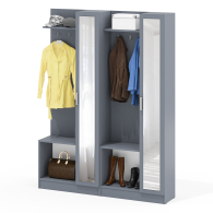 В каждом модуле слева сверху расположена панель с тремя двухрожковыми крючками под антресольной полкой, а внизу — открытая ниша для обуви. Справа — высокий пенал с распашной дверкой, оснащённой зеркалом в полный рост размером 20х190 см. Внутри пенала три полки, верхняя и нижняя из них съёмные. Сборка не универсальная — дверь с зеркалом всегда справа, а панель с крючками — слева. Такой комплект обеспечивает вдвое больше мест для хранения и два зеркала, что особенно удобно для семейного использования. Пластиковые подпятники защищают пол от повреждений и делают установку безопасной для напольного покрытия.