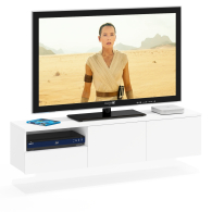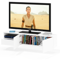 Тумба удобно размещается на стене под телевизором, освобождая пространство на полу и придавая интерьеру лёгкость. Слева находится открытая ниша для техники и аксессуаров, под ней — выдвижной ящик на шариковых направляющих для хранения мелочей. Справа расположено отделение за двумя распашными дверками, идеально подходящее для скрытого хранения. Благодаря подвесной конструкции тумба создаёт ощущение простора и облегчает уборку под ней. Сборка не универсальная — открытая ниша и выдвижной ящик всегда располагаются только слева. Фасады не имеют ручек — открывание ящика и дверок осуществляется за край. Крепление к стене осуществляется с помощью трёх угловых навесов, обеспечивающих надёжную фиксацию.