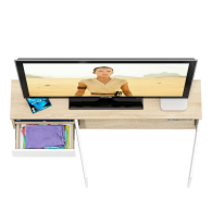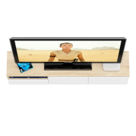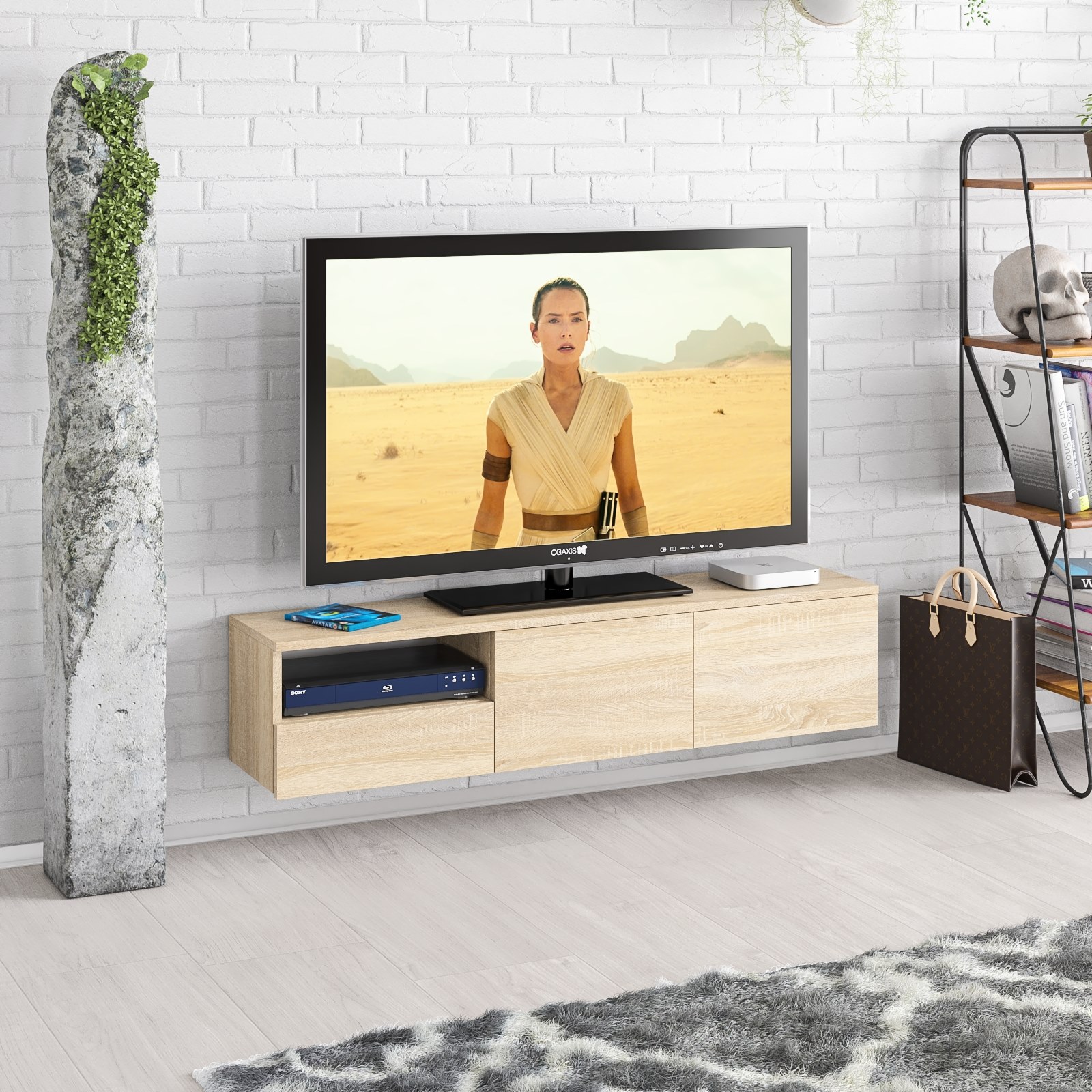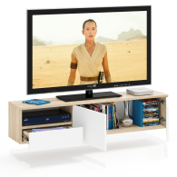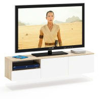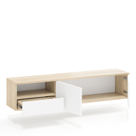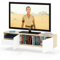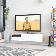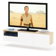 Тумба удобно размещается на стене под телевизором, освобождая пространство на полу и придавая интерьеру лёгкость. Слева находится открытая ниша для техники и аксессуаров, под ней — выдвижной ящик на шариковых направляющих для хранения мелочей. Справа расположено отделение за двумя распашными дверками, идеально подходящее для скрытого хранения. Благодаря подвесной конструкции тумба создаёт ощущение простора и облегчает уборку под ней. Сборка не универсальная — открытая ниша и выдвижной ящик всегда располагаются только слева. Фасады не имеют ручек — открывание ящика и дверок осуществляется за край. Крепление к стене осуществляется с помощью трёх угловых навесов, обеспечивающих надёжную фиксацию.