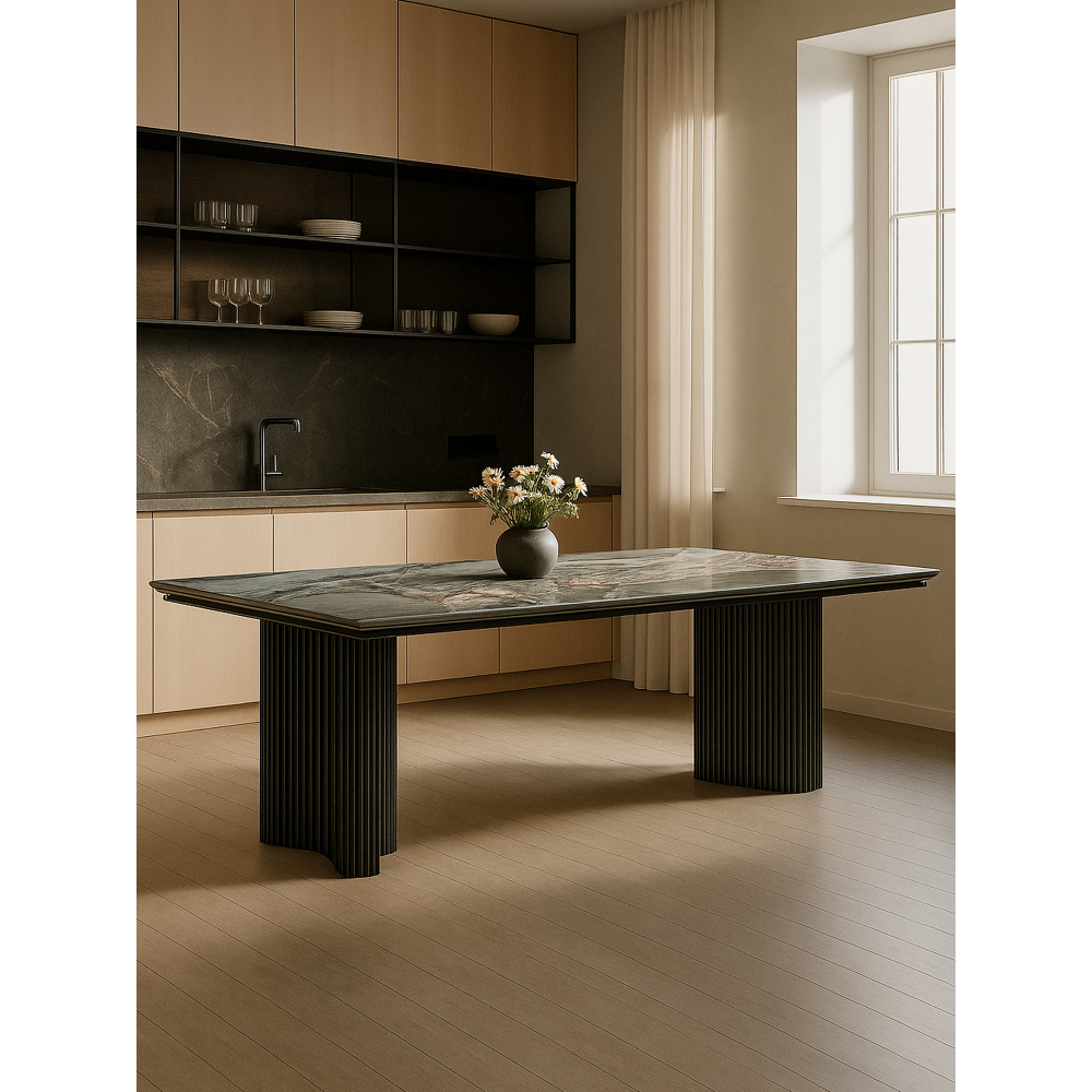 Керамический стол «Мален» – свобода от компромиссов Строгий силуэт с керамической столешницей, которая: Неуязвима для царапин и горячих чашек Сохраняет идеальную поверхность годами Легко очищается за секунду Металлические ножки с антикоррозийным покрытием добавляют лёгкую индустриальную ноту. Размеры 240х110 см – золотая середина между компактностью и комфортом. Идеален для: Минималистов Поклонников практичной эстетики Хозяев, ценящих время (уход = 30 секунд в неделю) «Мален» – когда красота требует нулевых жертв.