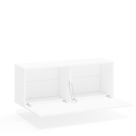 Тумба монтируется на стену, экономя пространство и создавая лёгкий визуальный эффект. Модель оснащена двумя отделениями без полок, каждое закрыто откидной дверкой на газлифтах, которые обеспечивают плавное и надёжное открывание. Такая компоновка отлично подойдёт для хранения техники, аксессуаров и документов. Подвесная конструкция тумбы облегчает уборку и делает интерьер более воздушным. Фасады без ручек — дверки открываются за край, что подчёркивает лаконичный стиль мебели. Для крепления к стене предусмотрены три угловых навеса, обеспечивающих надёжную установку.