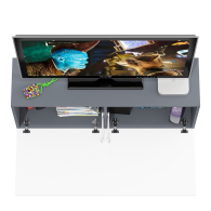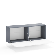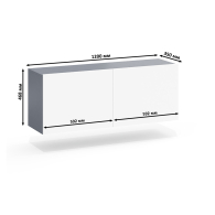 Тумба монтируется на стену, экономя пространство и создавая лёгкий визуальный эффект. Модель оснащена двумя отделениями без полок, каждое закрыто откидной дверкой на газлифтах, которые обеспечивают плавное и надёжное открывание. Такая компоновка отлично подойдёт для хранения техники, аксессуаров и документов. Подвесная конструкция тумбы облегчает уборку и делает интерьер более воздушным. Фасады без ручек — дверки открываются за край, что подчёркивает лаконичный стиль мебели. Для крепления к стене предусмотрены три угловых навеса, обеспечивающих надёжную установку.