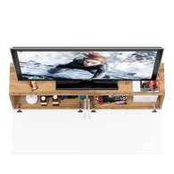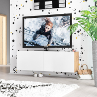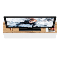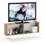 Благодаря подвесной конструкции, тумба не занимает место на полу и визуально облегчает пространство. Модель оборудована двумя вместительными отделениями без полок, каждое закрывается откидной дверкой на газлифтах — они обеспечивают плавное и тихое открывание. Такой формат хранения удобно использовать для техники, медиаплееров и прочих аксессуаров. Подвесной формат мебели не только визуально расширяет пространство, но и облегчает уборку под тумбой. Ручки отсутствуют — дверки открываются за край фасадов, сохраняя лаконичный внешний вид. Тумба крепится на стену при помощи трёх угловых навесов, обеспечивающих надёжность и устойчивость конструкции.