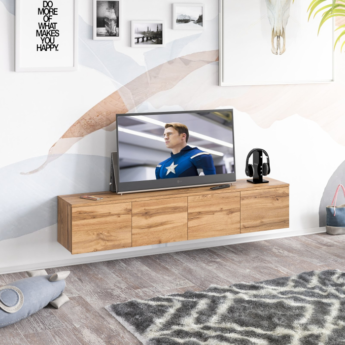 Благодаря подвесной конструкции тумба освобождает пространство на полу и визуально облегчает интерьер. В центральной части тумбы расположены два вместительных выдвижных ящика на шариковых направляющих. По бокам находятся отделения без полок, каждое скрыто за распашной дверкой. Подвесная установка позволяет не только сэкономить пространство, но и упростить уборку и прокладку кабелей. Тумба выполнена без ручек — ящики и дверцы открываются за край фасадов, подчёркивая лаконичный стиль. Монтаж осуществляется с помощью трёх надёжных угловых навесов, обеспечивающих устойчивое крепление на стене.
