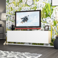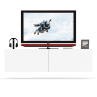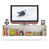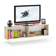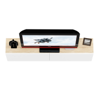 Благодаря подвесному монтажу, модель не занимает место на полу, создаёт ощущение легкости и упрощает уборку. Тумба состоит из двух просторных отделений, скрытых за откидными дверками на газлифтах, обеспечивающими плавное и бесшумное открывание. Отделения не имеют внутренних перегородок, благодаря чему подходят для хранения различной техники, медиаприставок и аксессуаров. Подвесная конструкция облегчает визуальное восприятие пространства и делает интерьер более современным. Фасады не имеют ручек — дверки открываются за край, подчёркивая минималистичный дизайн. Монтаж осуществляется при помощи трёх надёжных угловых навесов, обеспечивающих стабильную фиксацию на стене.
