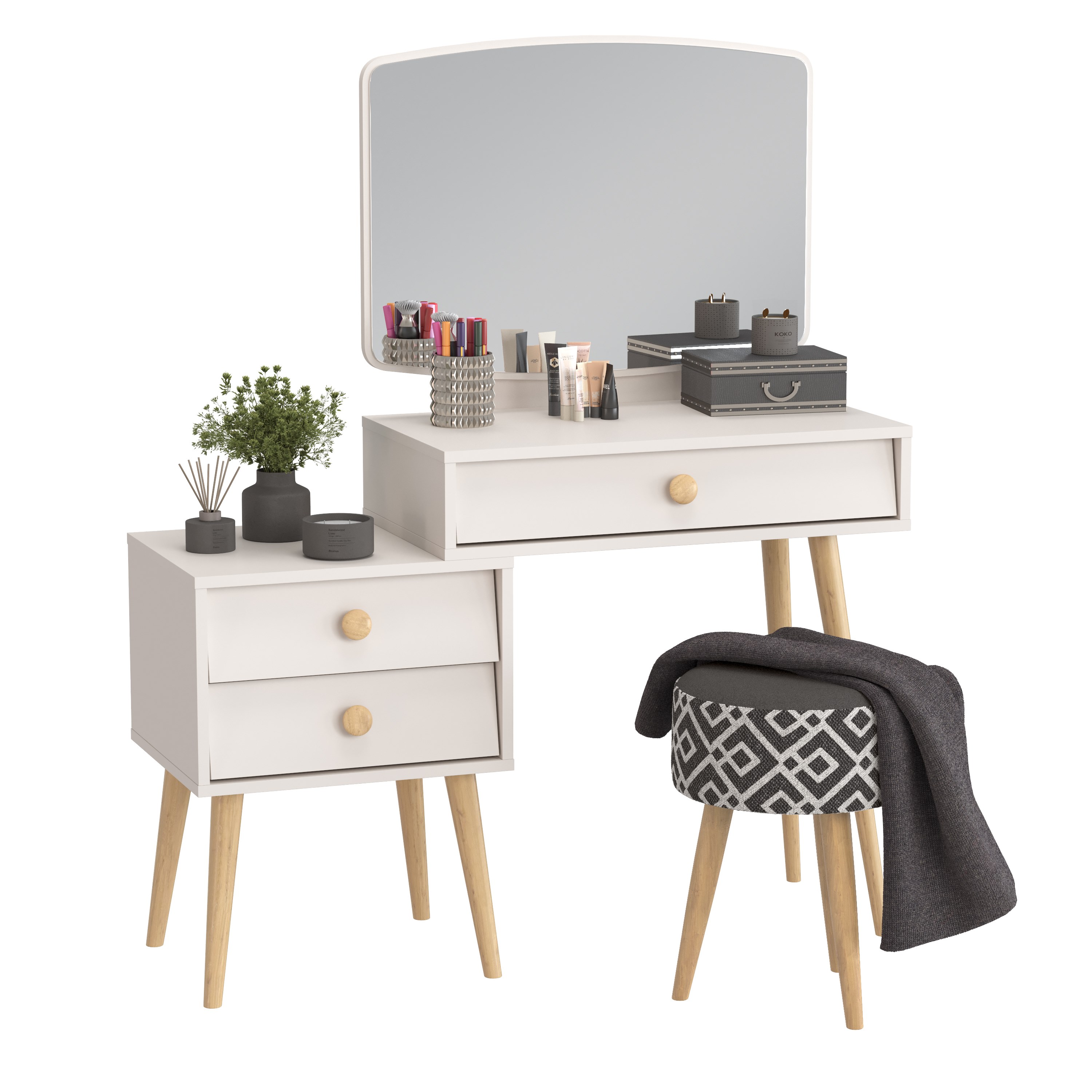 Трюмо объединяет функции туалетного столика и малой тумбы, предлагая удобные столешницы на разных уровнях для различных нужд. Оно оснащено тремя просторными выдвижными ящиками на шариковых направляющих полного выдвижения - один под столешницей столика и два в секции тумбы. Большое зеркало, расположенное над столешницей туалетного столика, создаёт удобную рабочую зону для ухода за собой, а также визуально расширяет пространство. Декоративные деревянные ручки круглой формы акцентируют внимание на природной эстетике, гармонично завершая его дизайн Трюмо установлено на высокие опоры из массива березы, которые добавляют лёгкости конструкции. Высота ножек у туалетного столика составляет 60 см, а у тумбы – 30 см, что подчёркивает элегантность изделия и облегчает уборку. Выполнено трюмо из ламинированной ДСП толщиной 16 мм, торцы окромлены ПХВ плёнкой.