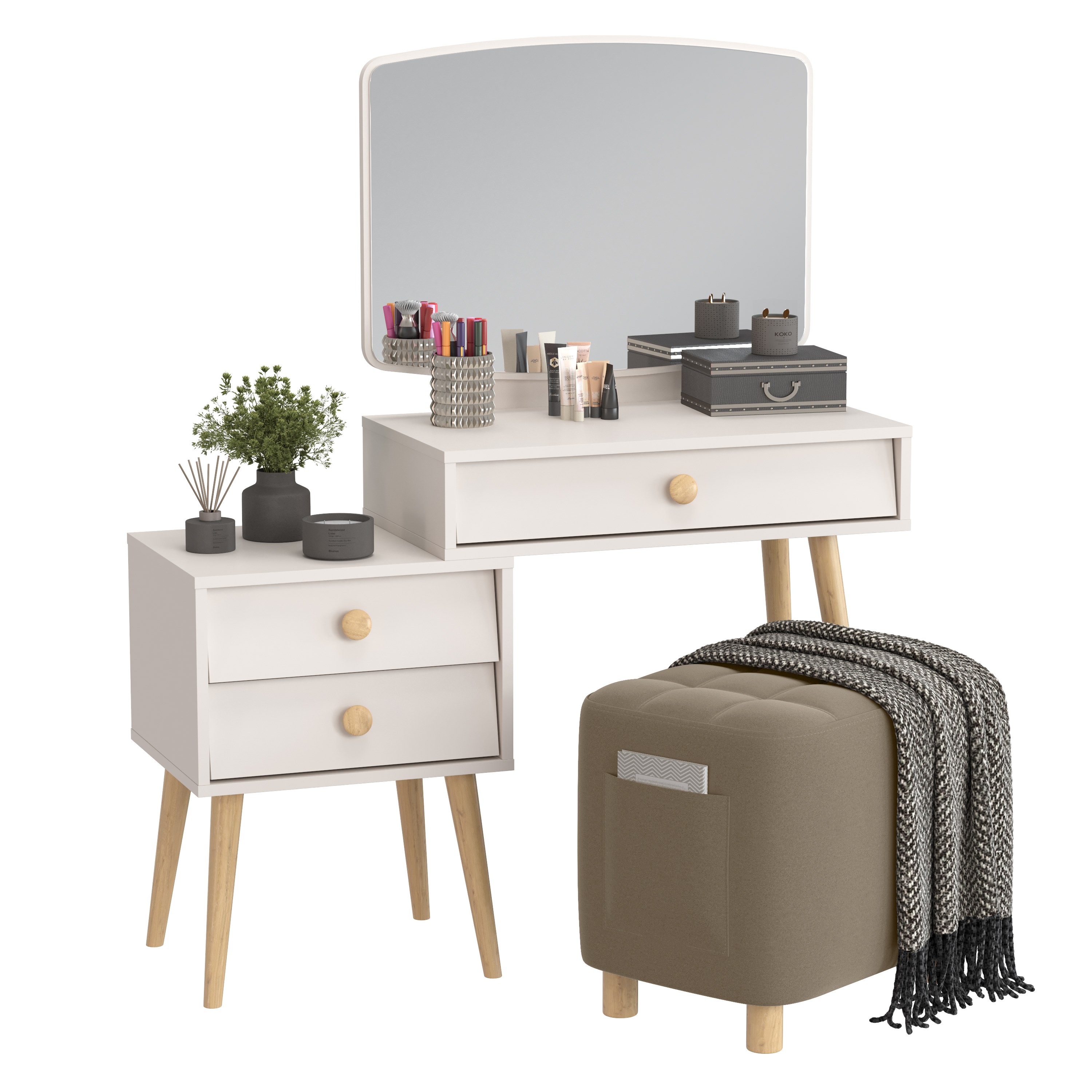 Трюмо объединяет функции туалетного столика и малой тумбы, предлагая удобные столешницы на разных уровнях для различных нужд. Оно оснащено тремя просторными выдвижными ящиками на шариковых направляющих полного выдвижения - один под столешницей столика и два в секции тумбы. Большое зеркало, расположенное над столешницей туалетного столика, создаёт удобную рабочую зону для ухода за собой, а также визуально расширяет пространство. Декоративные деревянные ручки круглой формы акцентируют внимание на природной эстетике, гармонично завершая его дизайн Трюмо установлено на высокие опоры из массива березы, которые добавляют лёгкости конструкции. Высота ножек у туалетного столика составляет 60 см, а у тумбы – 30 см, что подчёркивает элегантность изделия и облегчает уборку. Выполнено трюмо из ламинированной ДСП толщиной 16 мм, торцы окромлены ПХВ плёнкой.
