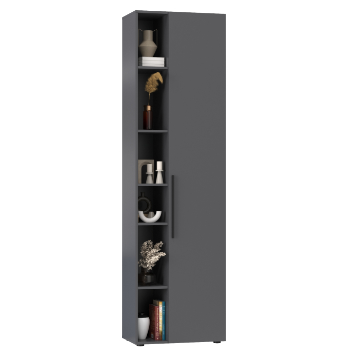 Шкаф оптимально впишется в интерьер прихожей или гостиной, где его сочетание закрытого и открытого хранения будет особенно полезным. Он состоит из двух отделений - закрытого шириной 36,6 см за распашной дверцей и открытого шириной 20,4 см. В закрытом отделении размещены пять полок, из которых две верхние и две нижние — съёмные, что позволяет гибко организовать внутреннее пространство. В открытом отсеке предусмотрено пять стационарных полок, идеально подходящих для книг, аксессуаров или декоративных элементов. Такая конструкция сочетает в себе как закрытое хранение, так и зону для предметов быстрого доступа. Шкаф имеет универсальную сборку — дверцу можно установить как с правой, так и с левой стороны, что позволяет адаптировать его к любой планировке помещения. Чёрная металлическая ручка подчёркивает современный стиль модели и обеспечивает удобство в использовании.