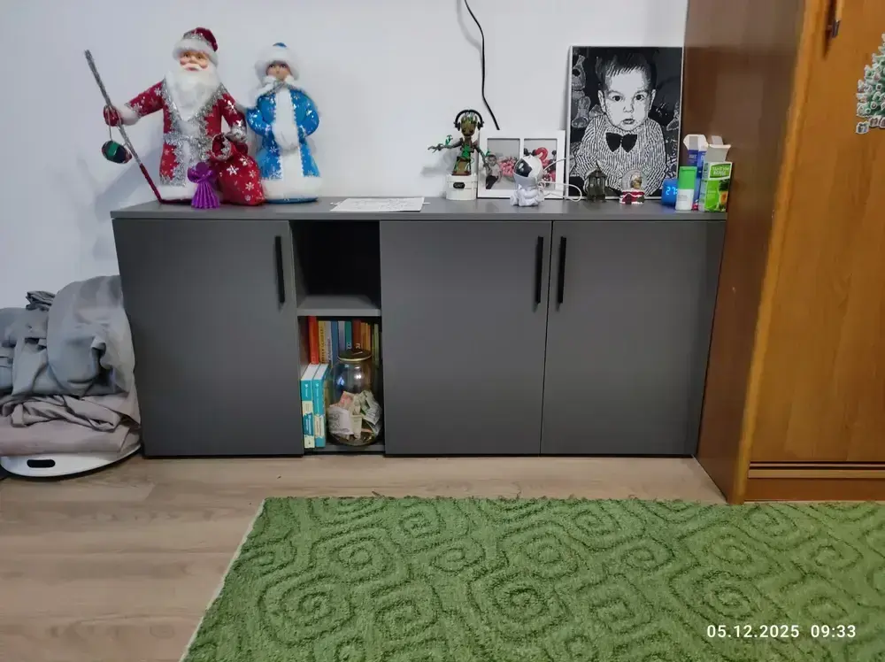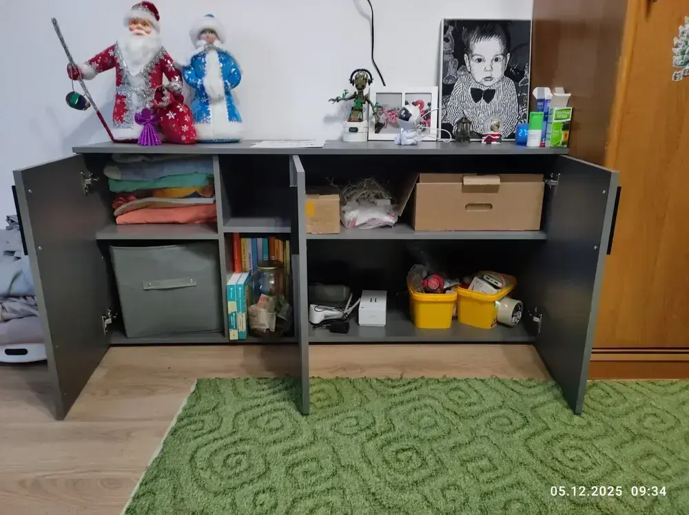 Просторная поверхность и закрытые секции позволяют удобно разместить технику и аксессуары. В центральной части тумбы расположена открытая ниша, удобная для размещения мультимедиа‑оборудования или декоративных элементов. С одной стороны имеется отделение с двумя дверцами, а с другой — с одной дверцей, внутри каждого из них расположена стационарная полка для хранения аксессуаров и других вещей. Конструкция выдерживает нагрузку до 15 кг на столешницу и до 5 кг на каждую внутреннюю полку, что делает её функциональной и надёжной. Тумба оснащена универсальной сборкой, позволяющей монтировать модули как с левосторонним, так и с правосторонним расположением. Для удобства эксплуатации и стильного акцента модель дополнена чёрными металлическими ручками, подчёркивающими современный дизайн изделия.
