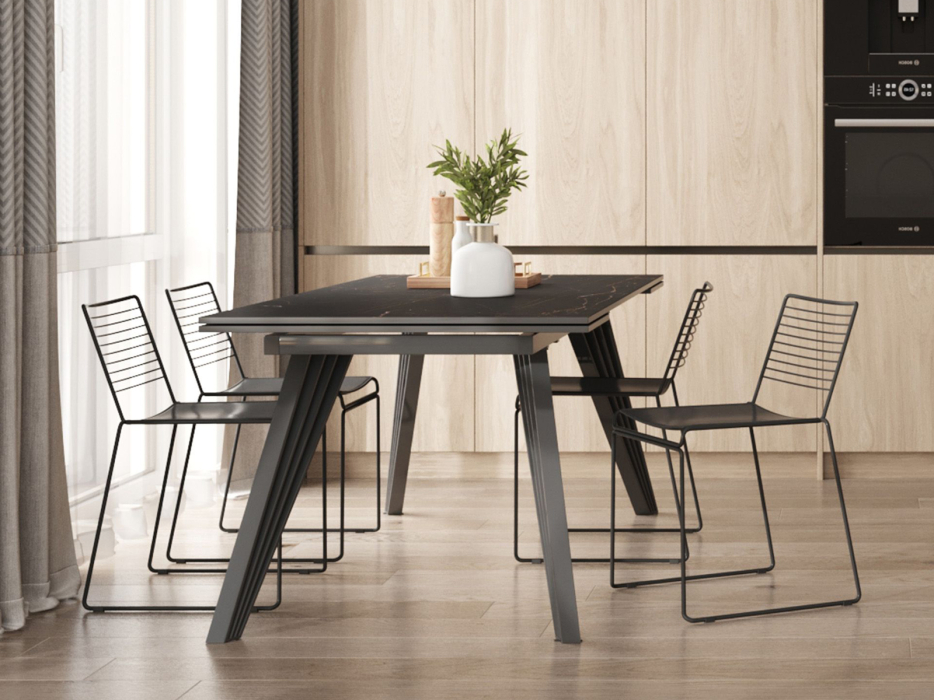 Стильный в сдержанным образе раскладной стол станет прекрасным дополнением для кухни и обеденной зоны. Столешница из темной керамики устойчива к повреждениям и истиранию, долговечный материал с прочной текстурой. По бокам стола расположены дополнительные раздвижные элементы, которые увеличивают полезную площадь столешницы на 40 или 80 см