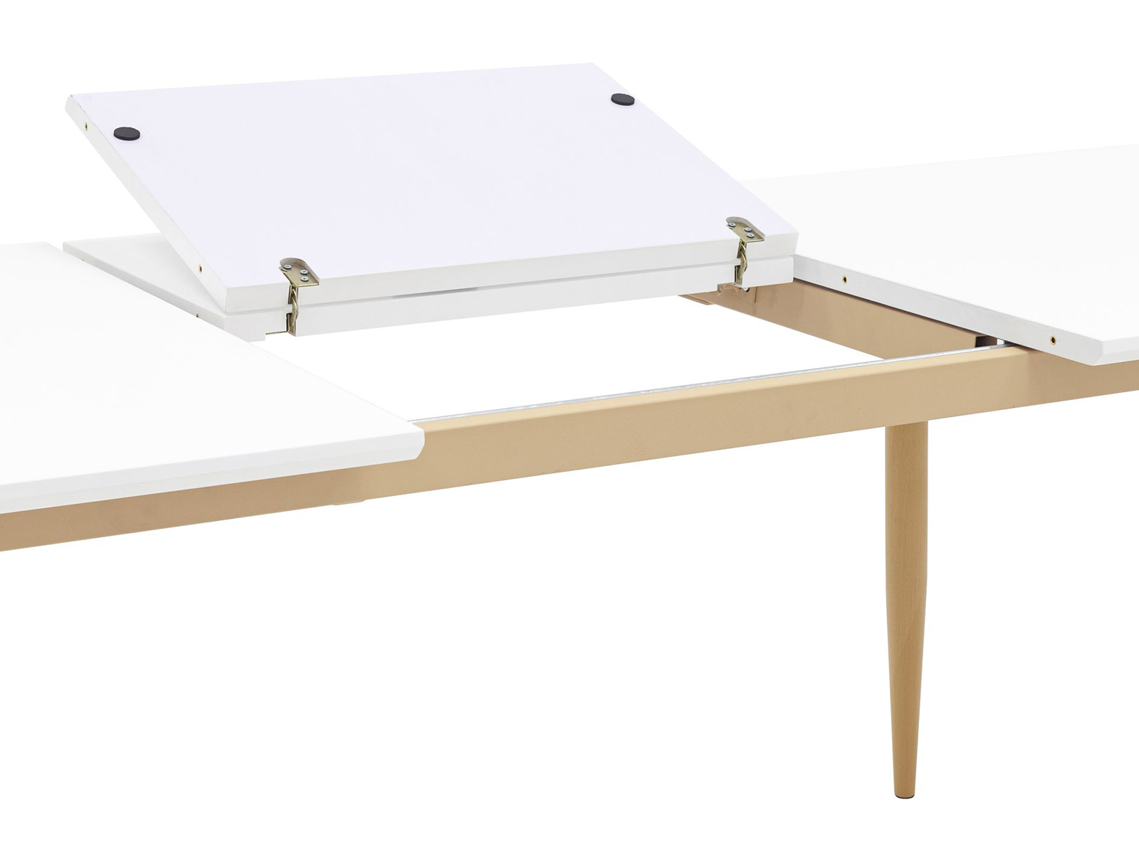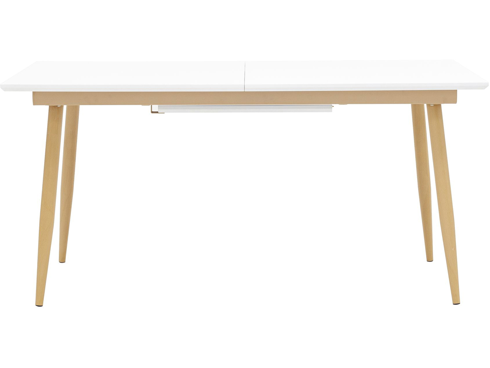 Обеденный стол с прямоугольной столешницей. Цвет столешницы белый. Ножки металлические, покрашены в цвет светлого дерева.