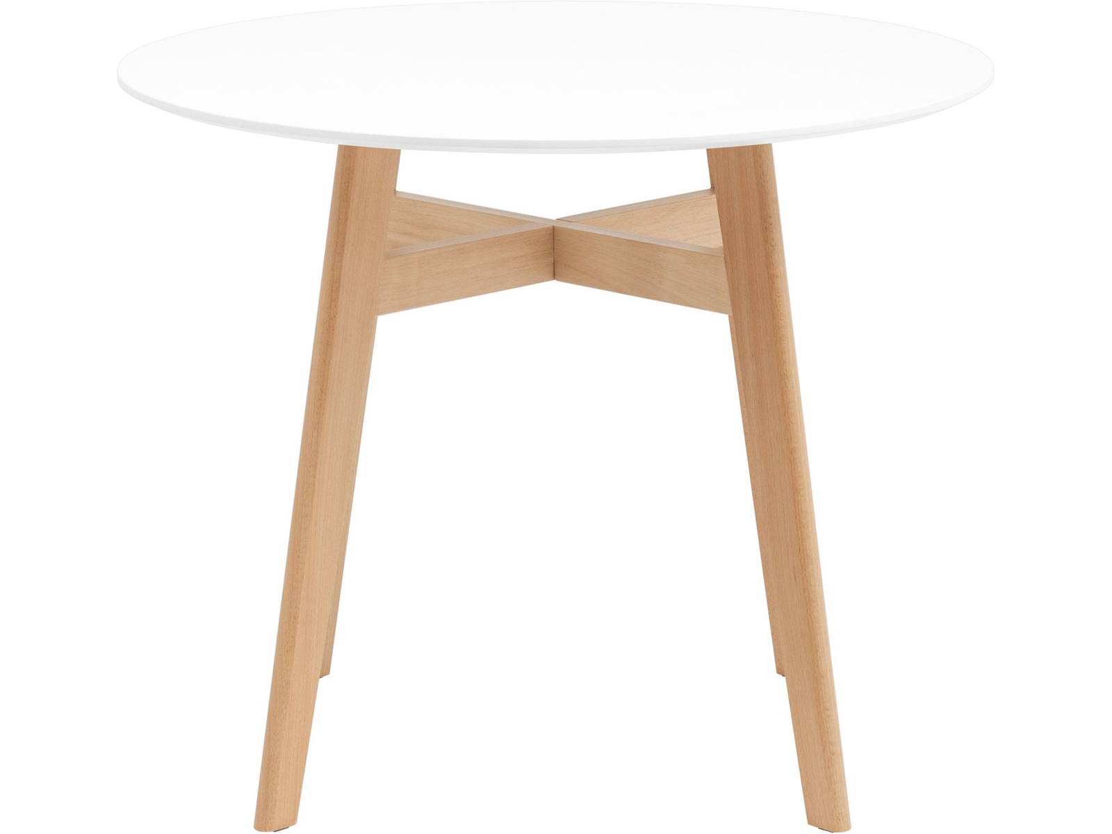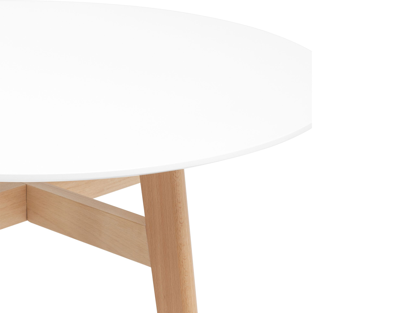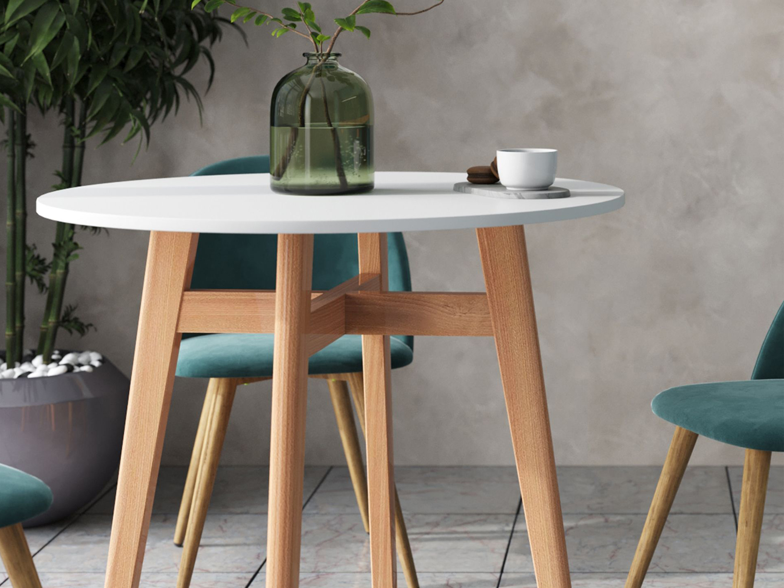 Круглая столешница выполнена из МДФ, окрашенного в белый цвет. Ножки стола изготовлены из массива дерева.