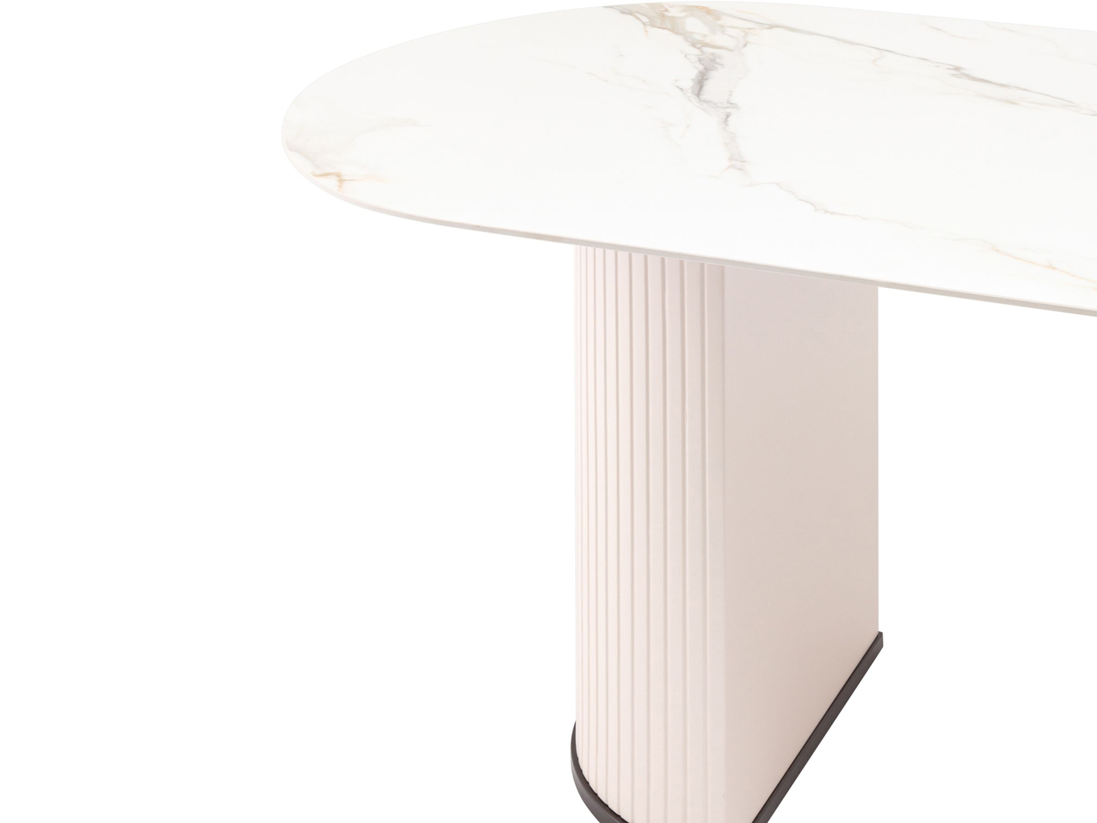 Столешница из керамики отличный вариант для кухни. Материал знаменит прочностью и долговечностью, поверхность устойчива к различным внешним воздействиям. Поверхность столешницы с рисунком белого мрамора гармонично сочетается с массивными ножками бежевого цвета. Простая овальная форма стола позволит легко вписать его в современный интерьер, стол украсит кухню, гостиную или современное кафе, ресторан. Опорные плиссированные ножки в лаконичном дизайне надёжно удерживают всю конструкцию и дополняют монолитный образ. Разрешенная нагрузка до: 120 кг
