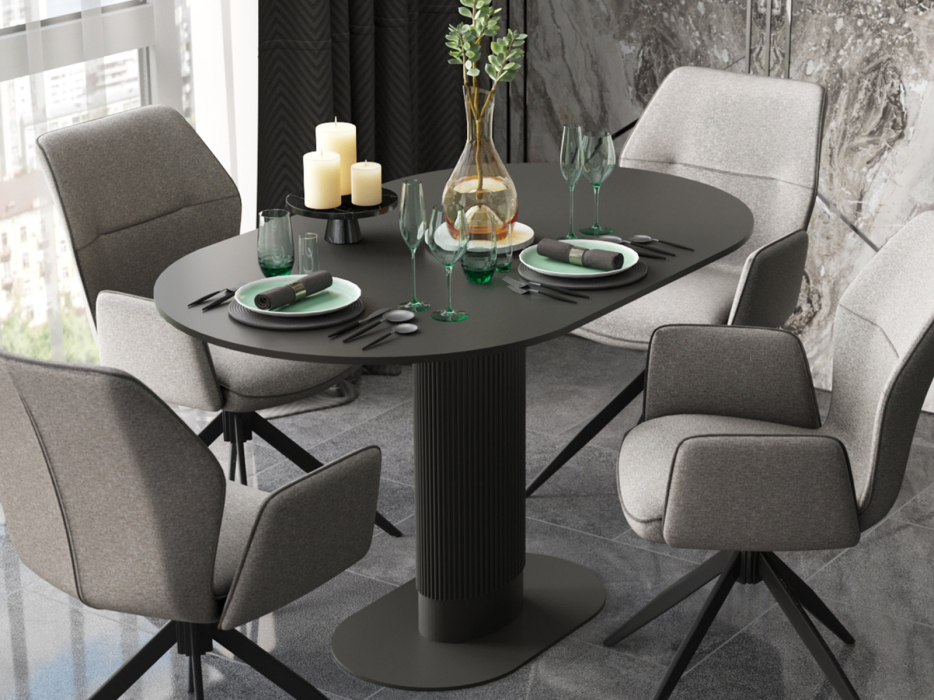 Обеденный стол Mystery станет украшением любой кухни, гостиной, обеденной зоны или современного кафе. Размер стола 130х80 см позволяет комфортно разместить четыре персоны. Столешница выполнена из керамики черного цвета, которая знаменита прочностью и долговечностью, поверхность устойчива к различным внешним воздействиям. Опорное плиссированное основание стола в лаконичном дизайне надежно удерживает всю конструкцию и дополняет монолитный образ. Современный стиль дизайна сочетает в себе функциональность и элегантность. Овальная форма столешницы создает уютную атмосферу и экономит пространство. Обеденный стол Mystery является отличным выбором для тех, кто ценит качество, стиль и комфорт. Разрешенная нагрузка до: 100 кг.
