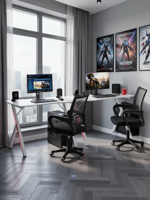 Два игровых стола Мебель--24 GT-2310 и два кресла компьютерных 103 — комплект объединяет в себе всё необходимое для комфортной игры или продуктивной учёбы.