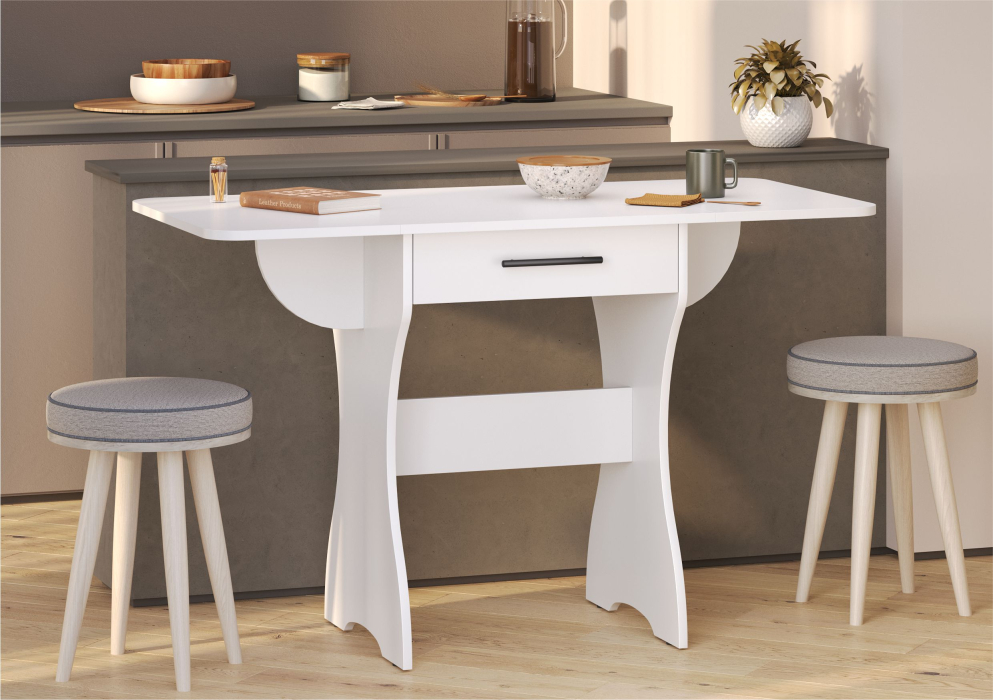 Удобный раскладной кухонный стол с выдвижным ящиком — идеальное решение для компактных и функциональных интерьеров. Надёжная модульная конструкция позволяет быстро трансформировать столешницу: в сложенном виде он занимает всего 600 мм длины, а при необходимости раскладывается до 1200 мм. Под столешницей расположен вместительный выдвижной ящик, в котором можно хранить мелкую кухонную утварь или текстиль.