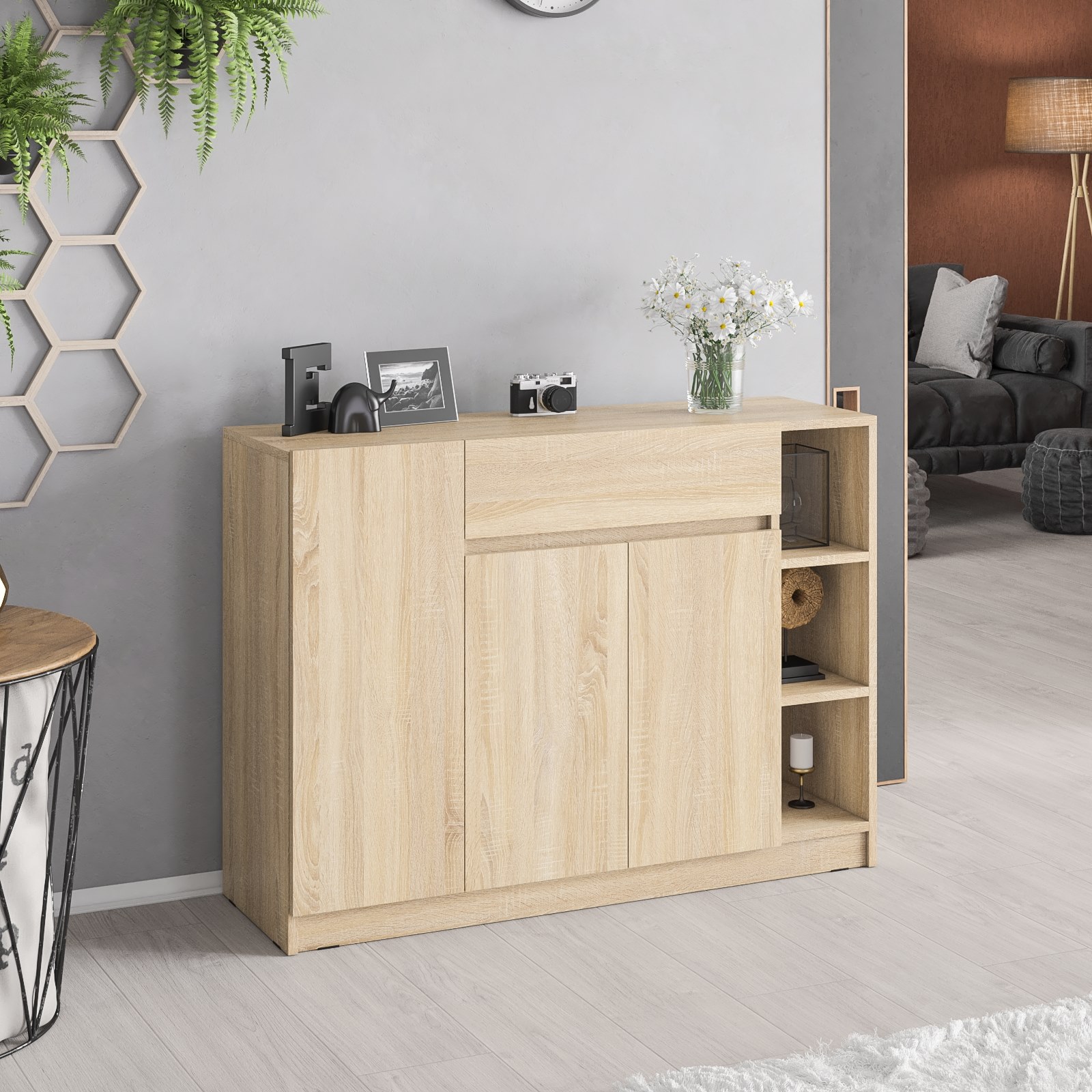 Конструкция включает правое отделение с распашной дверкой и съёмной полкой, центральный выдвижной ящик на шариковых направляющих длиной 350 мм, нижнее отделение со стационарной полкой за двумя дверками, а также открытую нишу с двумя съёмными полками справа. Отсутствие ручек и открывание за край фасадов создают лаконичный и современный внешний вид. Благодаря разнообразному наполнению, комод подходит для хранения одежды, обуви, аксессуаров, документов и других предметов. Пластиковые подпятники защищают пол от повреждений. Тумба-комод имеет НЕ универсальную сборку — ниша с открытыми полками всегда располагается справа.