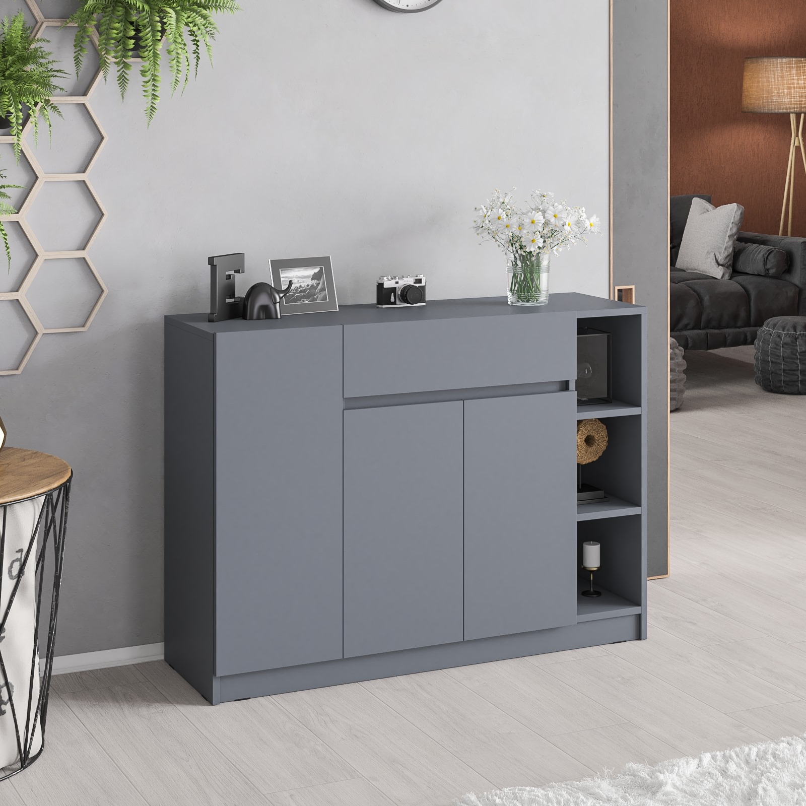 Конструкция включает правое отделение с распашной дверкой и съёмной полкой, центральный выдвижной ящик на шариковых направляющих длиной 350 мм, нижнее отделение со стационарной полкой за двумя дверками, а также открытую нишу с двумя съёмными полками справа. Отсутствие ручек и открывание за край фасадов создают лаконичный и современный внешний вид. Благодаря разнообразному наполнению, комод подходит для хранения одежды, обуви, аксессуаров, документов и других предметов. Пластиковые подпятники защищают пол от повреждений. Тумба-комод имеет НЕ универсальную сборку — ниша с открытыми полками всегда располагается справа.