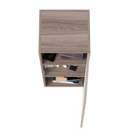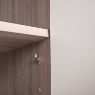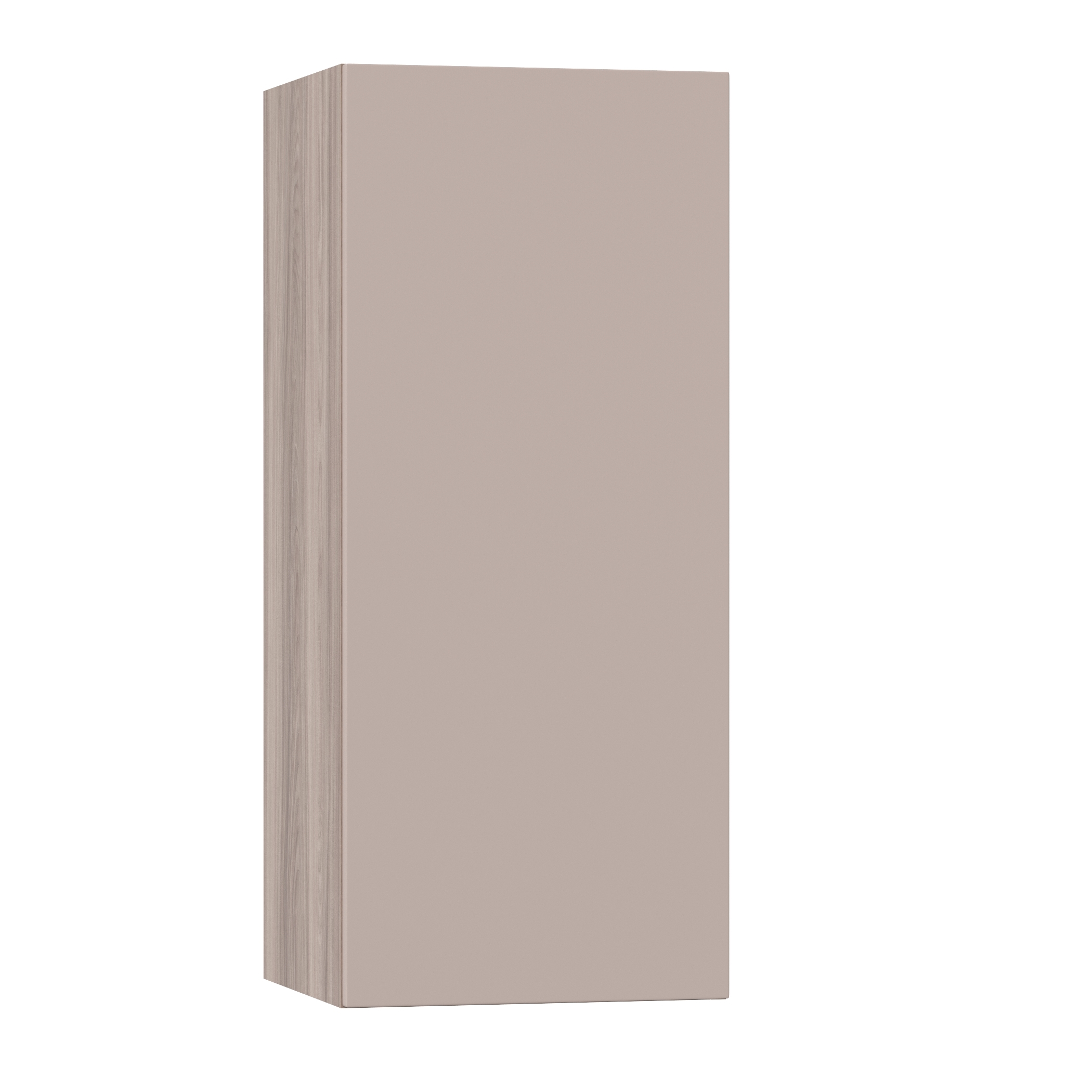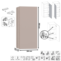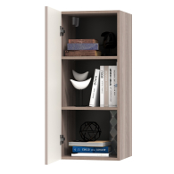 За распашной дверкой расположены две функциональные полки, которые можно снять или отрегулировать по высоте для оптимального использования пространства. Надёжное крепление полок обеспечивают специальные полкодержатели с шипом, дополнительно усиливающие каркас. Фасад с механизмом Push-to-Open делает использование шкафа удобным и безопасным. Петли с доводчиками обеспечивают плавное и тихое закрытие дверей. Механизмы SCARPI для настенного монтажа позволяют точно выровнять шкаф по горизонтали и вертикали. Задняя стенка в паз обеспечивает плотное примыкание к стене и аккуратный внешний вид изделия.