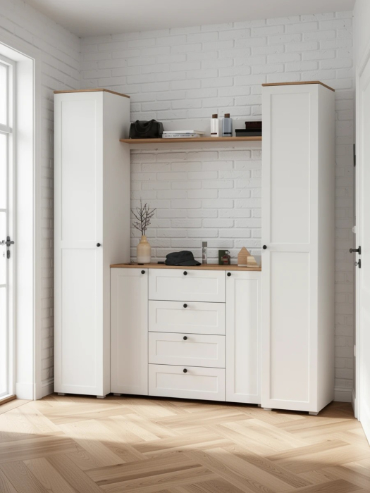 Два платяных пенала в прихожую с комодом Остин и навесной открытой полкой – современное решение для прихожей, сочетающее стиль, практичность и функциональность.