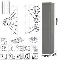 В комплектации два пенала. Каждый пенал имеет распашную дверь и внутри расположено шесть полок. Максимальная нагрузка на каждую полку - 5 кг. Каждый шкаф-пенал имеет два варианта наполнения - 6 полок или штанга с антресольной и нижней полочками. Четыре центральные полочки являются съемными и при необходимости, Вы оперативно можете переоборудовать пенал, установив штангу для одежды на плечиках. Универсальная сборка дверей - могут быть установлены как на левую, так и на правую сторону.