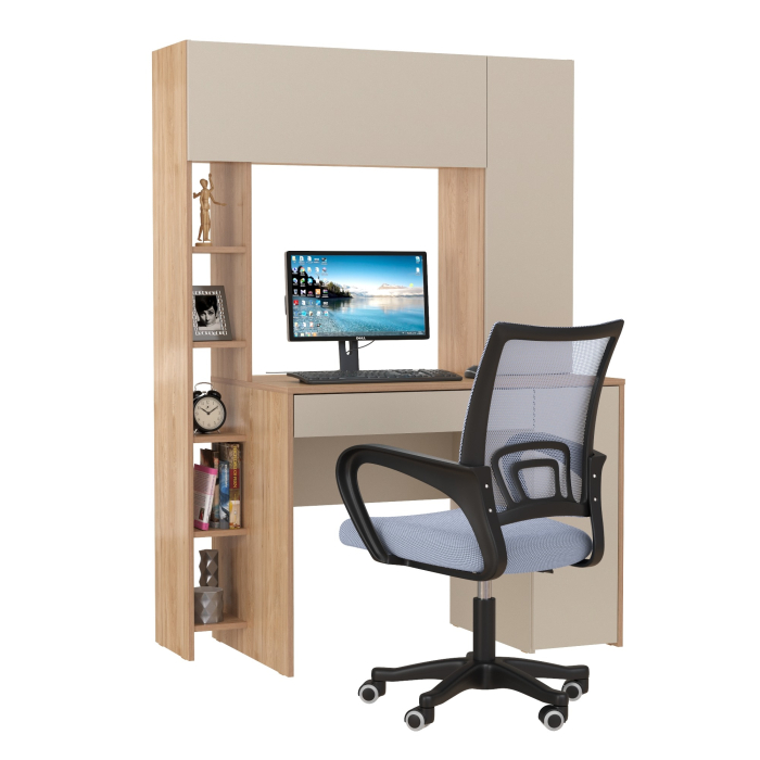 Удобный и устойчивый, с тумбой под системный блок и выдвижным ящиком для канцелярии, дополнен практичной надстройкой. Надстройка с вместительной нишей за откидным фасадом и распашным отделением с полкой, выделяет на столе удобную нишу для монитора. Закрытые отделения стола хранят деловые тайны, а пять полок стеллажа - документы, книги в удобной близости. Тумба расположена с правой стороны стола компьютерного, стеллаж - с левой. Дверки и ящик стола открываются за край фасада. Распашные двери мебели на четырёхшарнирных петлях без доводчиков, откидные фасады - на газовых лифтах, ручки - пластик. В выдвижных ящиках столов и тумб используются металлические направляющие.