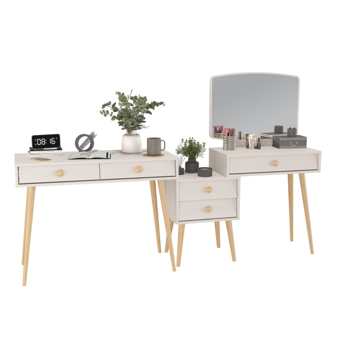 Трюмо Афина 4-25901 объединяет функции туалетного столика и малой тумбы, предлагая удобные столешницы на разных уровнях для различных нужд. Оно оснащено тремя просторными выдвижными ящиками - один под столешницей столика и два в секции тумбы. Большое зеркало, расположенное над столешницей туалетного столика. Трюмо установлено на опоры. Высота ножек у туалетного столика составляет 60 см, а у тумбы – 30 см. Универсальная сборка позволяет расположить тумбу с левой или с правой стороны.