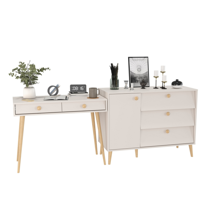 Туалетный стол с ящиками Афина и комод с дверкой и тремя ящиками – практичный комплект, создающий уютное пространство! Теплый цвет кашемир серый добавляет интерьеру уют и гармонию, прекрасно дополняя современный декор спальни.