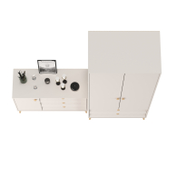 Деревянные ручки круглой формы, выполненные в цвете бук. Модули установлены на высокие опоры из массива бука в цвете Тик, которые добавляют лёгкости конструкции и делают её удобной для уборки. Ящики на шариковых направляющих полного выдвижения. Поставляется в разобранном виде.