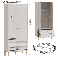 Двухдверный шкаф для одежды Афина 4-75901, за распашными дверями которого антресольная полка и штанга для одежды. Под отделением с дверями 2 ящика. Шкаф установлен на опоры высотой 16 см.