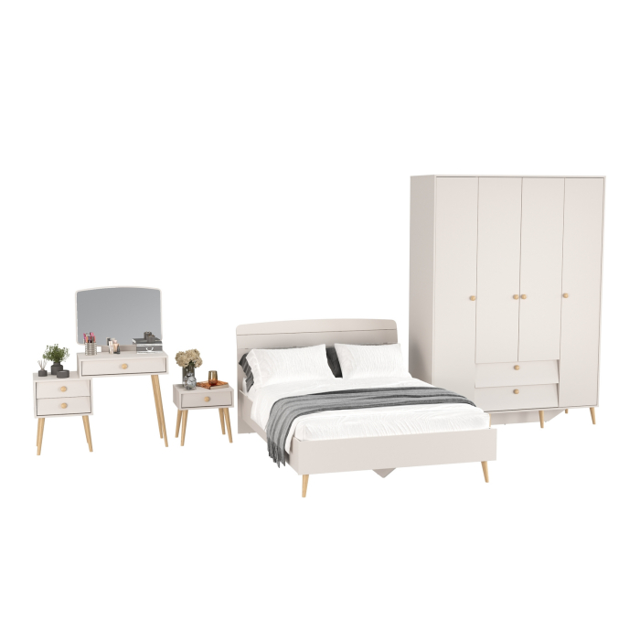 Комплектация включает кровать 1400 Афина 4-22911, тумбу прикроватную Афина 4-09901, трюмо с зеркалом Афина 4-25901 и шкаф 4-х дверный Афина 4-75930.