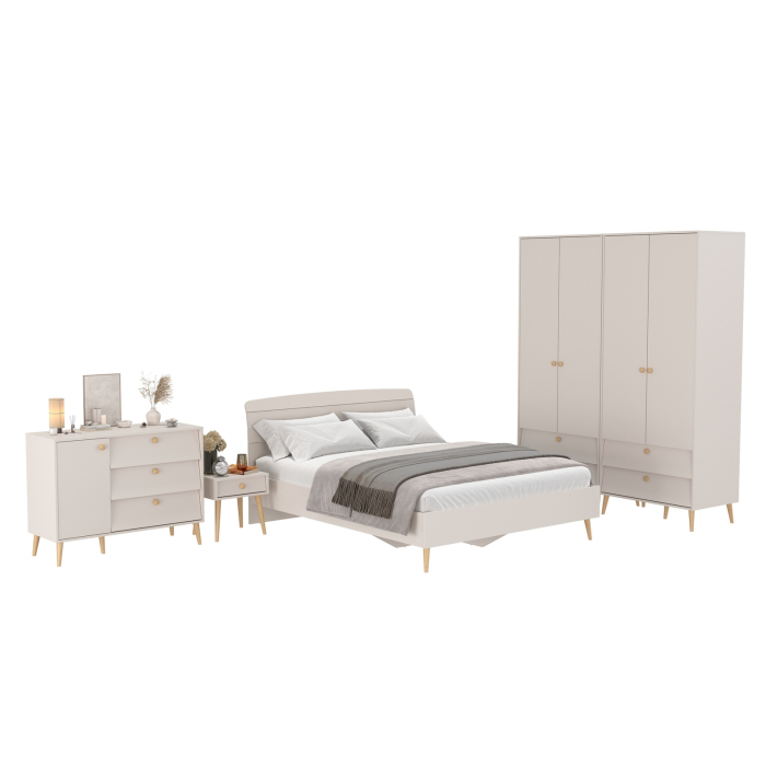 Шкафы двухдверные с кроватью двуспальной 1600 Афина с тумбочкой на ножках и комодом – изящное воплощение минимализма и утонченного стиля! Теплый цвет кашемир серый добавляет интерьеру уют и гармонию, прекрасно дополняя современный декор спальни.