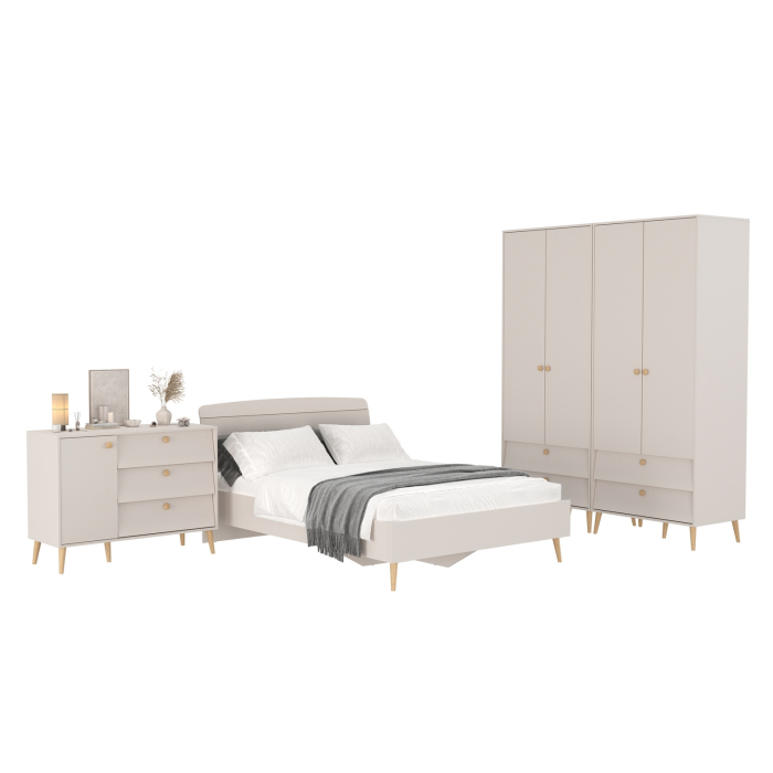 Афина кровать 1400 с комодом и двумя шкафами – стильный и удобный комплект мебели для спальни. Теплый цвет кашемир серый добавляет интерьеру уют и гармонию, прекрасно дополняя современный декор спальни.