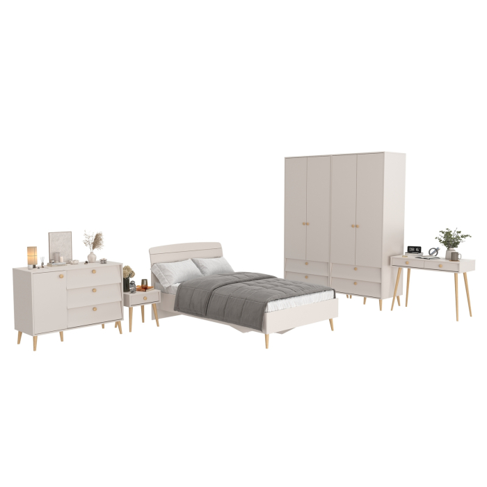 Комплектация включает кровать 1200 Афина 4-22905, тумбу прикроватную Афина 4-09901, туалетный столик Афина 4-25904, комод с дверкой и тремя ящиками Афина 4-44901 и два шкафа 2-х дверных Афина 4-75901.