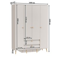 Четырехдверный шкаф это 3 закрытых отделения и мини-комодик. Центральная часть за 2 дверками с антресольной полкой и штангой для одежды на плечиках. Под ней 2 выдвижных ящика. По бокам 2 отделения с 4 полками в каждом, скрытыми за распашными дверками. Шкаф установлен на опоры высотой 16 см.