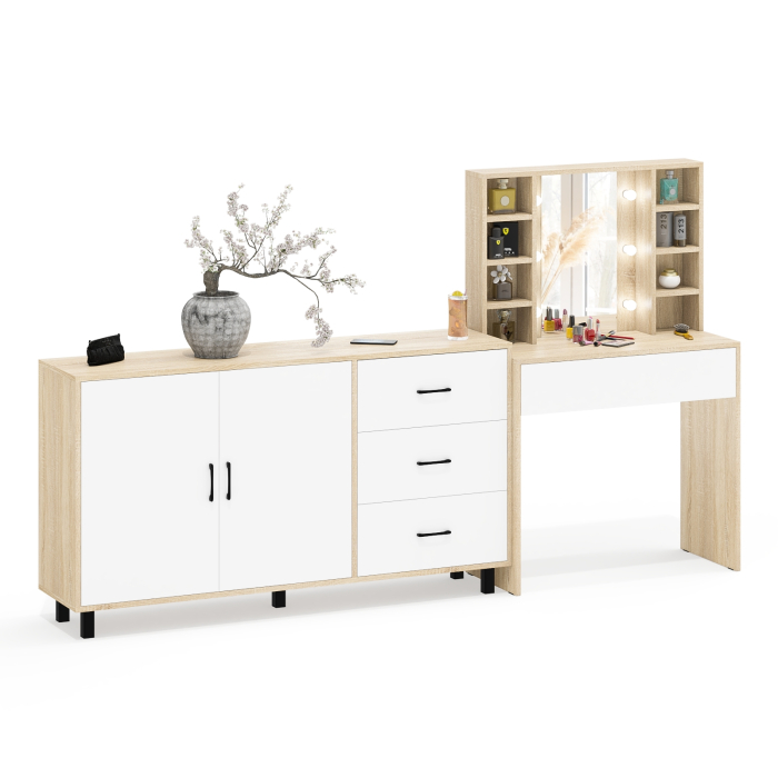 Косметический стол с подсветкой и ящиком 115 и комод 123-1604 — современный комплект, который гармонично впишется в интерьер спальни. Подсветка и вместительный комод обеспечивают удобство в повседневном использовании.