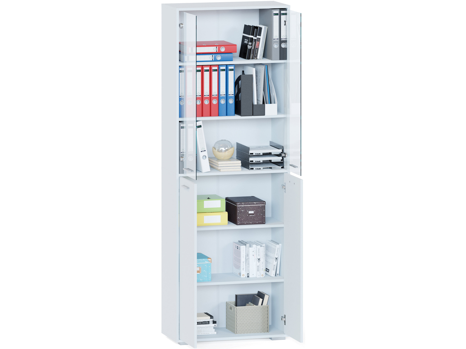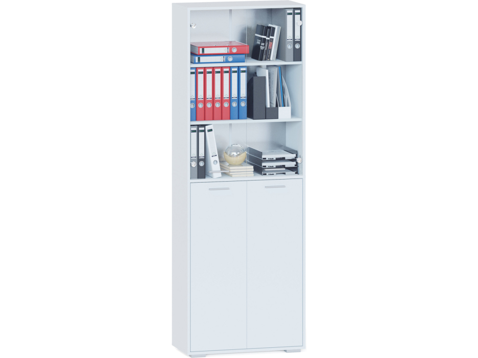 Стеллаж ШУ-355 — стильное решение для хранения документов, канцелярии и книг в вашем офисе и дома. Деревянный стеллаж поможет максимально эффективно использовать пространство, предоставляя достаточно места для хранения всего необходимого. Вместительный стеллаж имеет два отделения с полками, верхнее со стеклянными дверьми. В каждом отделении по три полки. Корпус и полки изготовлены из качественного ламинированного ДСП толщиной 16 мм, самого популярного материала для производства корпусной мебели, обеспечивающего необходимую прочность и долговечность деталей.