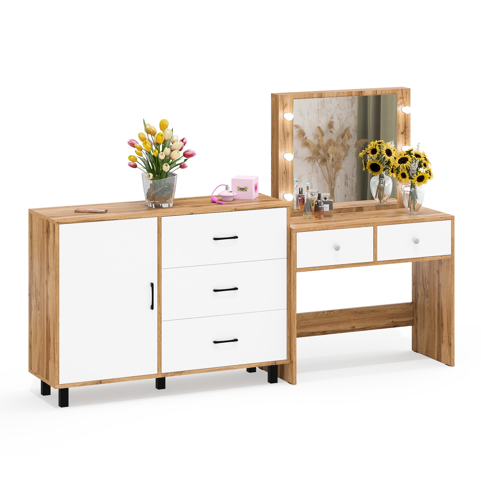 Стол туалетный для спальни с лампочками СТ-5 и тумба-комод 122-1204 — гармоничный комплект, сочетающий практичность и изысканный дизайн. Отлично подойдёт для современных интерьеров.